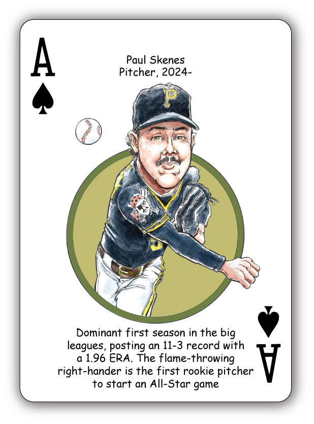 Update card for the Pittsburgh Baseball Hero Deck. This card features Paul Skenes, Ace Pitcher for the Pittsburgh Pirates. In only 2 years in the Biggs, Paul is already one of the all-time Pirate greats. This Limited Edition card is Made in the USA.