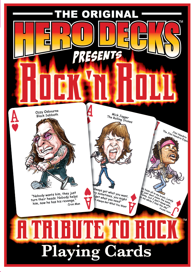 The Rock 'n Roll Hero Deck playing cards feature fifty-two of the greatest musicians in Rock 'n Roll's history. Thoughtfully organized, the face of each playing card is colorfully illustrated with a different hero ... this deck is sure to make heads bang with Rock 'n Roll fans of all ages!